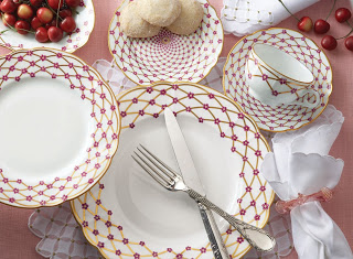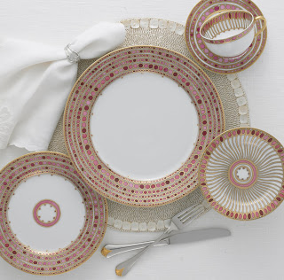 Channel the spirit of cherry blossoms with pink china from Whitney Smith Pottery, Villeroy & Boch, Robert Haviland & C. Parlon, and Herend."