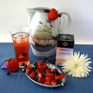 This Memorial Day I was thinking about the American Flag, and the sacrifice so many individuals and families have had to make. Living a military life is no easy feat, especially when loved ones are lost. As I was browsing the supermarket for summer treats I came across this tea. Stash Premium sells a Fusion Red White & Blueberry tea. "Antioxidant-rich rooibos, also known as red tea is slightly sweet and full-bodied. The addition of delicate white tea and 100% natural blueberry flavor creates a truly pleasant tea, delightful for day-long sipping." Not only that but turn it into an iced tea and you have the perfect Memorial Day drink. We paired it here with skewers of fresh strawberries, blue berries and watermelon and chilled it in our Constitution Open Cider Jug (S1986 - $205)