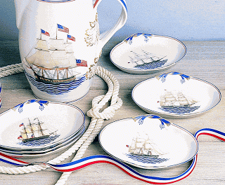 The American Ships Collection commemorates six early U.S. vessels: the frigates Chesapeake and Constitution, the clipper ships Flying Cloud and Nightingale, the first-class packet ship Yorkshire of New York and the auxilliary packet ship Massachusetts. Each ship is identified on the back of the plates, mugs and oval trays. This set of 6 trays is perfect for displaying finger food at your Memorial Day lunch or for individual serving plates for each person to walk around with.