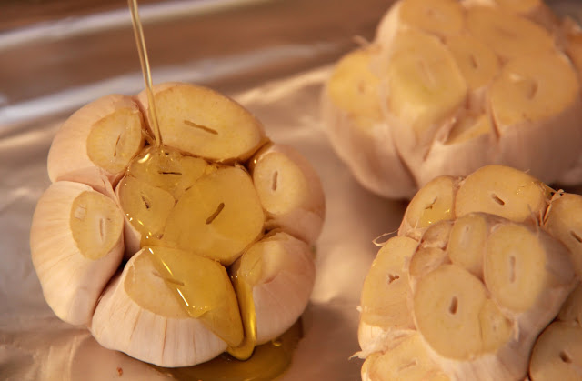 All you have to do is cut the tips off of the garlic head, peel away the outside excess skin, douse in a couple tablespoons of olive oil, let sit for 10 minutes, cover in tinfoil and pop in a 375 degree oven for 45 minutes.