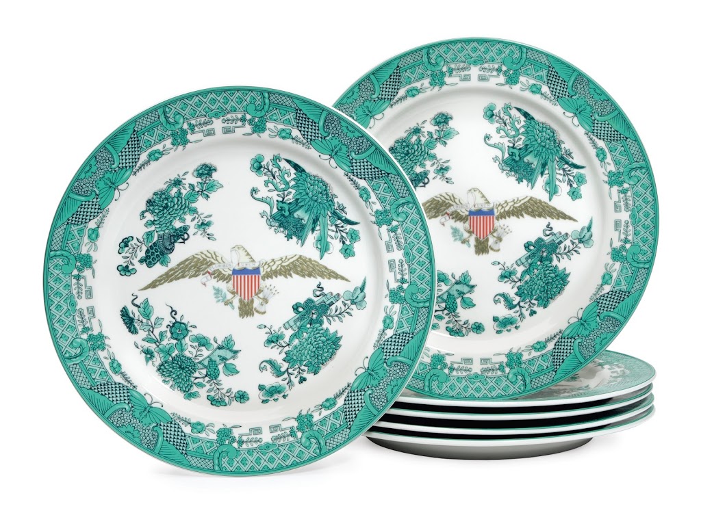 Some of the items with state motifs (symbols of the United States) will also be on auction at the Christie’s. Those are a pair of Mottahedeh porcelain Chinese Export-style bottle coolers, and an extraordinary set of six Mottahedeh Chinese Export-style plates (from the President’s inauguration).
