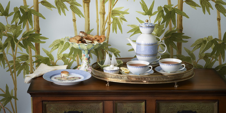 Cornflower Lace Tea for Two is a gift that will delight a couple or a person who just loves a small pot of tea. It is designed to stack and be put on a shelf. The delicate teardrop border was inspired by Ch’ing Dynasty (1644 - 1911) porcelain from China and is highlighted by bands of 22 karat gold.