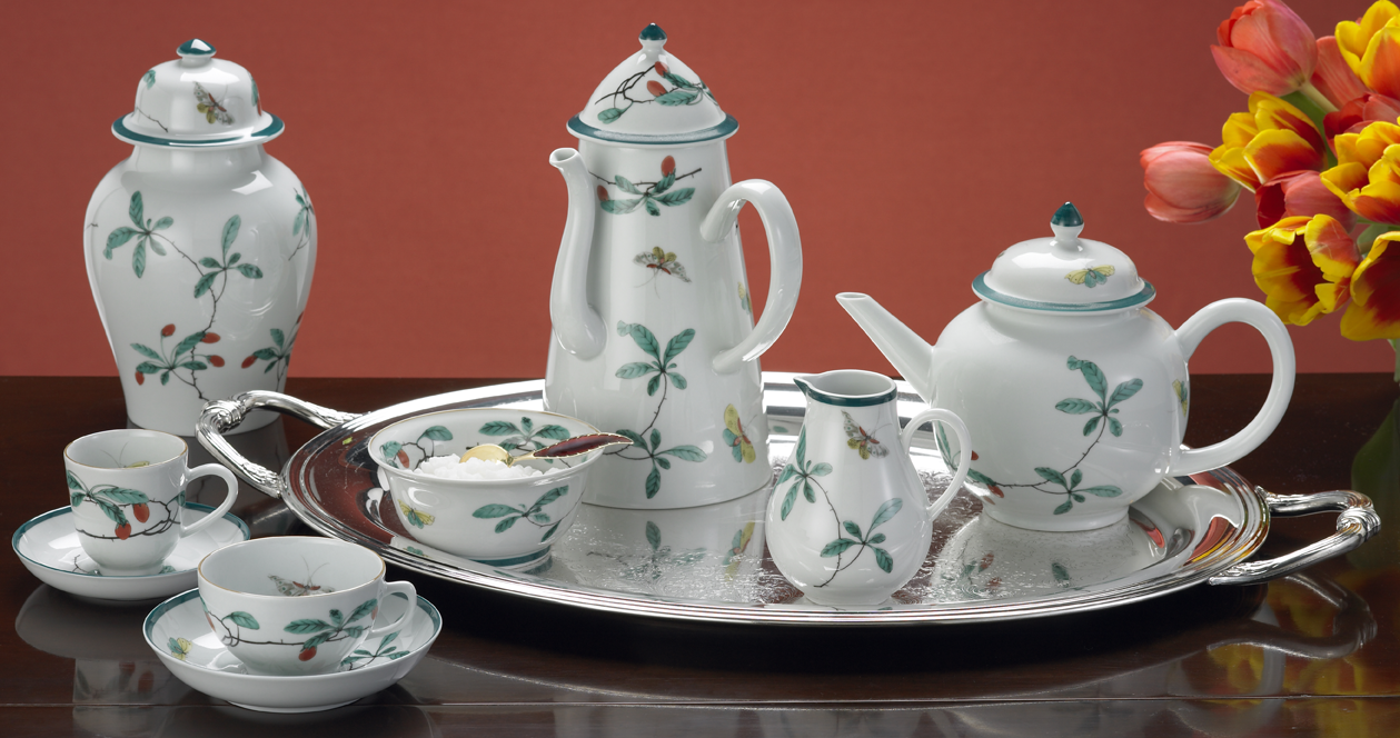 This graceful design with its leaves, berries and butterflies was derived from antique Chinese palace porcelain. The period is Kangxi (1662-1722) and the decoration is called Famille Verte or Green Family. This was a period when porcelain makers discovered the properties of copper for green and iron for red in a delightful and enduring style, enlarging their repertoire of producing a simpler treatment using just blues.
