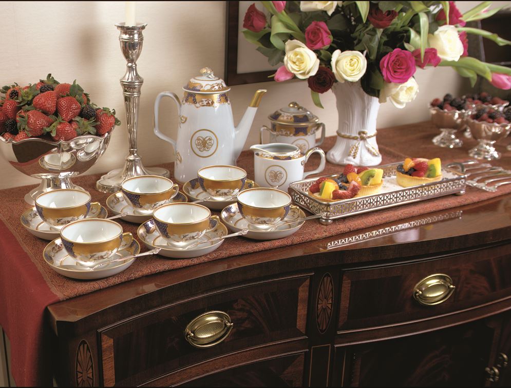 This pattern was chosen by Nelson Rockefeller, former Vice President of the United States, when he and Mrs. Mottahedeh launched a reproductions business together. The original of this service was made in China for the East India Company between 1736 -1795. The design is actually a moth with outstretched wings on a blue starry field,juxtaposed with birds flying in a light-filled sky.